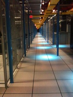 I thought some might find this interesting. Most who work outside of tech (and many inside tech) never see data centers like this. To get to our company servers in this hosting facility I have to pass through two man traps and a total of 5 doors with hand scanners. In addition, each rack of equipment is locked with a unique 6 digit code. There are hundreds of cameras inside the main datacenter and guards constantly watching from a secure room. Any people or equipment that pass into or out of the facility must be scheduled and itemized and will be inspected prior to being allowed to pass. The weather inside is kept cold and at 50% humidity and the white noise from all the computer and cooling equipment is so loud it’s difficult to have even a yelling conversation more than a few feet apart. Above you are several layers of infrastructure.. cooling returns, copper and fiber data, AC and DC power feeds of various voltages and tons of cameras and motion sensors… miles and miles of wire. The tiled floor is raised about 18″ off the real floor and it’s through this space that the cooled air raises through perforated floor tiles along the front of the racks (known as the cold isle).