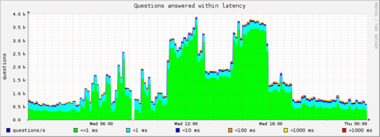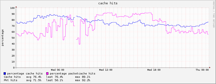 We have had a Power DNS recursing cacher deployed at one of our busiest sites for a few months now and I thought others might benefit from some real world performance info. This is running on some older hardware.. dual Xenon 2.8Ghz system with 4G of ram and the only job it’s doing is running this recursor. These three graphs tell the tale. The first shows that the system is handling peaks of about 3800 queries per second and that about 99% of those are being answered in a fraction of a millisecond. The second shows that cache hits are averaging about 70-75% and the third shows that it’s doing this work while using at most one quarter of the CPU. Add to those impressive performance levels that I’ve had zero issues since putting it in production six months ago.