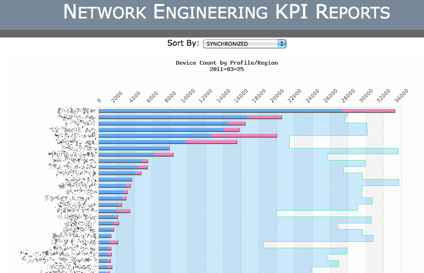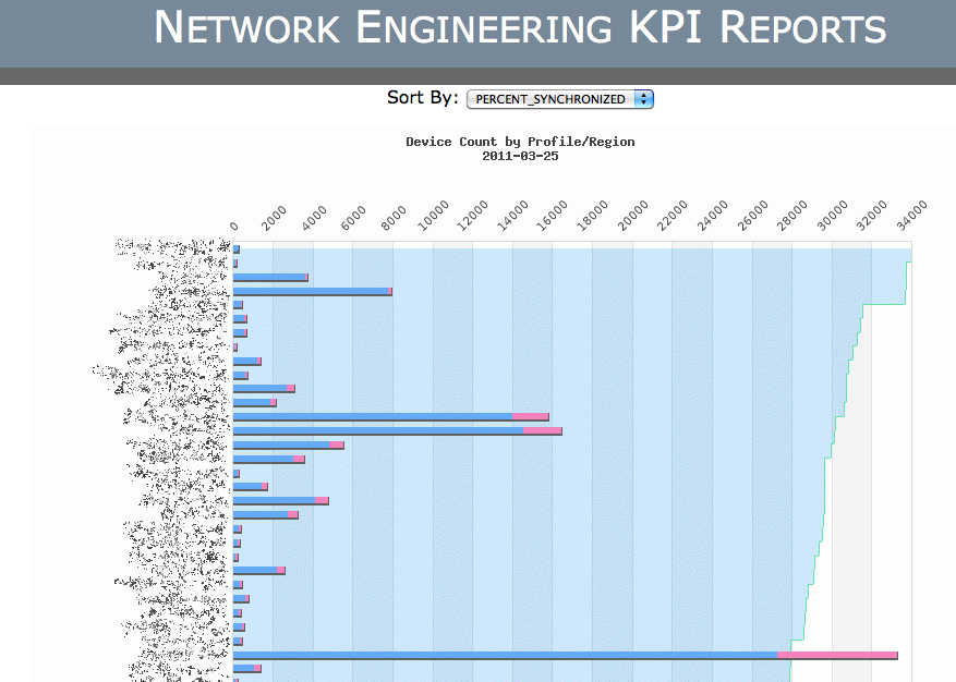 Another project called for the automation of several reports that upper management wanted to see from our engineering group. Unlike say sales or marketing.. it can be difficult to quantify the things we do in any sort of meaningful way. I was able to pull together lots of reporting data though on operational aspects of the network and the customer devices we have in the field. To make this as hands off (for us) as possible I wrote a database backed template system that allowed those on the top floor to choose from a range of reports with custom date ranges and generate either downloadable spreadsheets or in some cases fancy dynamic graphs. These example images show the same data set sorted different ways for a certain point in time and were created with the JpGraph php library. These graphs can also be combined to show a running animation of how things change over a period of months or years. This was the front end for data that was collected from several different (and incompatible) systems and distilled down to reports that anyone could make sense of.