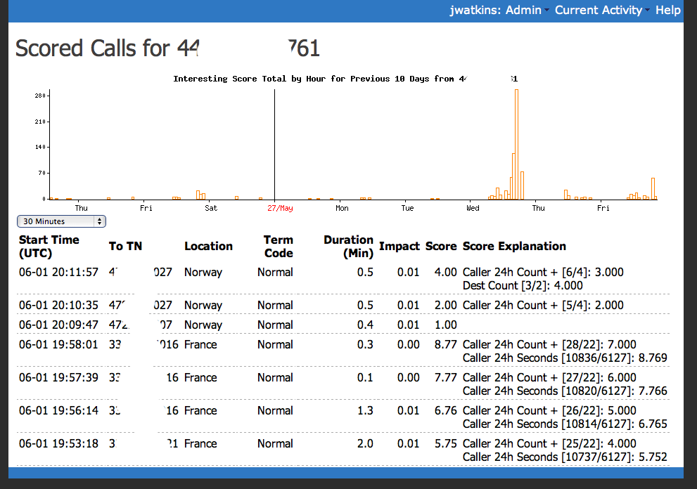This system does a sort of dynamic baselining of both ends of every call to determine a score value that represents how far from normal the current behavior is for that caller.