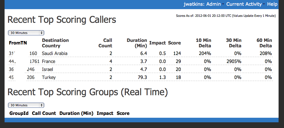 This shows a progression of the interface during a normal day when nothing unusual was going on. It’s not obvious.. but many elements in the data are clickable to pull up different views centered around certain elements like a specific caller or specific country.. or activity between a specific pair of countries. The time scale can also be adjusted from the default of 30 minutes out to all data we have in the database which currently goes back 45 days.